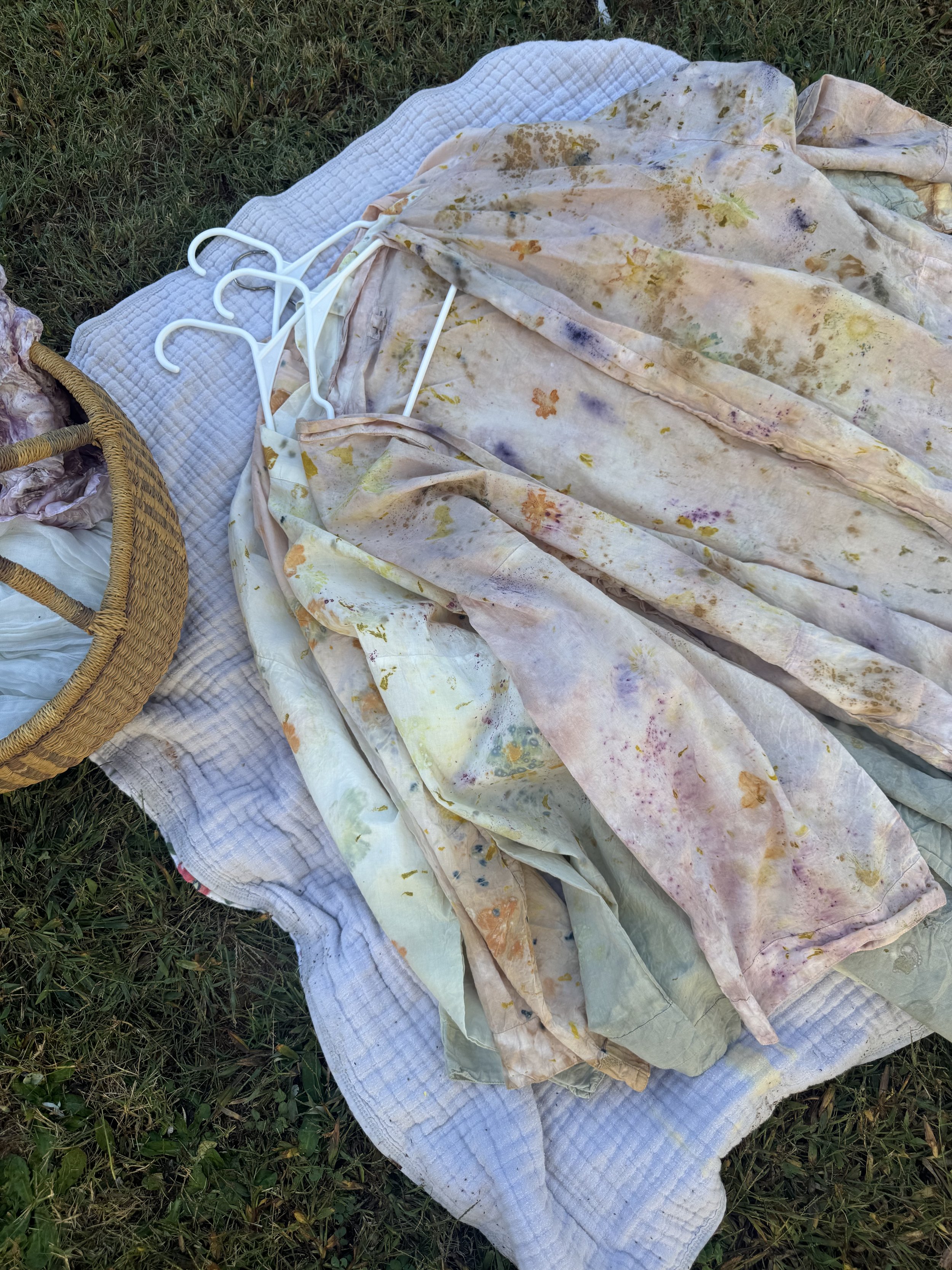 Custom dye projects start at $45 for small garments (client-provided) and vary depending on fabric type, size, and desired color palette. Each piece is individually hand-dyed using botanicals grown or foraged seasonally.